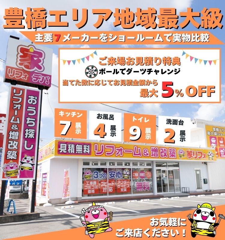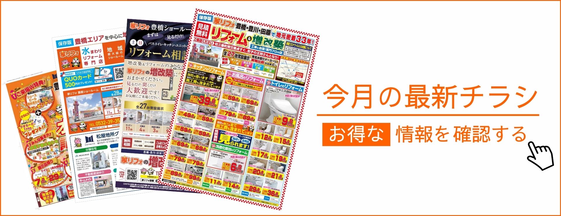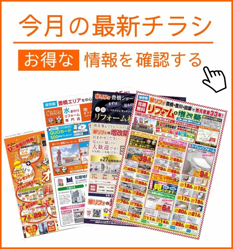 いつも家リフォ 豊橋ショールームをご愛顧いただきありがとうございます。 最新のチラシ情報を掲載いたしました!! 豊橋市、豊川市、田原市、蒲郡市で キッチン・浴室・トイレ・洗面化粧台・外壁・屋根・塗装・エクステリアにお悩みなら 家リフォ豊橋ショールームへお気軽にご相談ください。 ご相談・見積り無料です♪