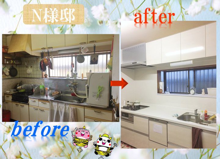 こんにちは♪本日はシステムキッチンの施行事例をご紹介させて頂きます✨見違えるほど素敵なキッチンに変わりました♪ご覧ください♪ before after ポイント! before☘after 以前クロスだった壁や窓下も汚れの付着を防ぎ、お掃除ラクラクなパネルへご変更されました。生ごみシューターも使用出来るよう電気スイッチも設置♪機能性の良いピカピカのキッチンに生まれ変わりました✨ご依頼を頂きまして誠にありがとうございましたm(__)m❤ 【商品名 ファーストプラス2700】【商品価格 ¥355,000】【工事期間 2日間】