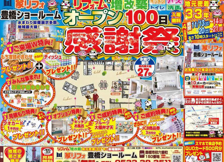 皆様こんにちは♪日に日に冬の足音が聞こえてくる季節になりましたね☘ 今週末13日・14日で100日祭イベントを開催致します♪新しいキッチン、新しい浴室、新しいトイレなどで新年を迎えたい!そんな方必見!お得な特典満載! スタッフ一同、お待ち致しております♪
