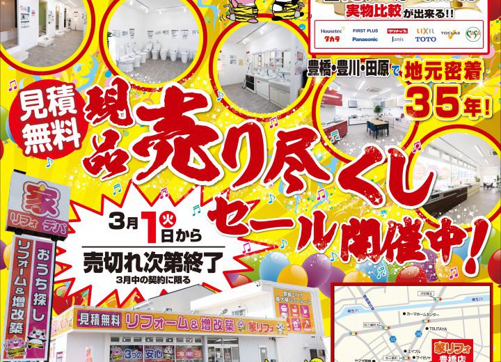 皆様こんにちは♪ ついに‼始まりました‼【売り尽くしセール】開催中です‼ リフォームをご検討の方で価格でお悩みの方、是非この機会に、ご来店くださいませ。 展示商品の為、早いもの勝ちです! 皆様のお越しをスタッフ一同お待ち致しております♪