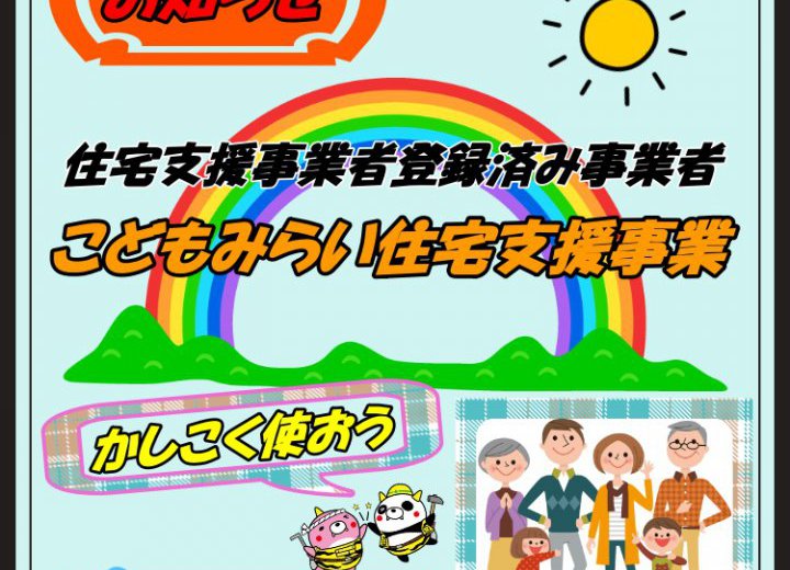 《事業内容》 子育て支援及び2050年カーボンニュートラルの実現の観点から、子育て世帯や若者夫婦世帯による高い省エネ性能を有する新築住宅の取得や住宅の省エネ改修等に対して補助することにより、子育て世帯や若者夫婦世帯の住宅取得に伴う負担軽減を図るために、「こどもみらい住宅支援事業」が創設されました。リフォームは、全ての世帯を対象(法人でも可)とし、対象工事を行うことで最大300,000円(別途条件を満たす場合は最大600,000円)の補助金が交付(現金給付)されます。 《申請期間》 令和4年3月頃~遅くとも令和4年10月31日 補助金の申請は、原則工事完了後です。 ※注意点としては「予算が無くなり次第終了」されるので、ご利用される方はできるだけ早くご検討下さい。 《補助金額》 実施する補助対象工事および発注者の属性等に応じて5万円~60万円 以前に同じ国土交通省から行われていた、グリーン住宅ポイントや次世代住宅ポイントと大きく異なる点は、今回はポイントではなく現金にて還元される点です(^^)/ 詳細は国土交通省の公式HPをご確認ください(*^_^*) ↓公式HPをチェック↓ こどもみらい住宅支援事業【公式】 (mlit.go.jp) こどもみらい住宅支援事業 "ご自身の検討されているリフォーム内容が制度の対象なのかわからない!"そんな方もぜひ家リフォにご相談ください!スタッフがわかりやすくご説明させていただきます(^^♪)