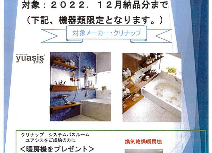 クリナップのユニットバスプレゼントキャンペーンが始まります♪ 対象商品をご成約していただいた方に換気乾燥暖房機をプレゼント! 収納がたっぷりあり、掃除もしやすいユニットバスになっております。 お風呂のリフォームをお考えの方にはとてもお得な情報です!この機会にぜひ家リフォ豊橋ショールームにお越しください♪