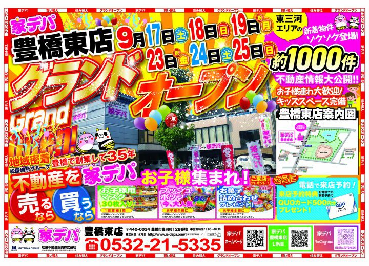【家デパ豊橋東店 グランドオープンのお知らせ】 松屋地所グループ、 【松屋不動産販売 家デパ豊橋東店】ついに グランドオープン致します‼ 9月17日(土)・18日(日)・19日(月) 23日(金)・24日(土)・25日(日) 不動産を売るなら、買うなら家デパ‼ 皆様のお越しをお待ち致しております♪