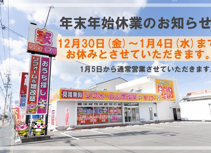 お世話になっております。 家リフォ豊橋ショールームです。 2023年も残り僅かとなってまいりました。 2022年はいかがお過ごしでしたか? 年末年始の休業のお知らせになります。 2022年12月30日(金)~2023年1月4日(水)迄お休みとさせていただきます。 2023年1月5日より通常営業となります。 休業中のお問い合わせにつきましては、2023年1月5日から順次対応させていただきます。 ご迷惑をお掛け致しますが、よろしくお願い致します。 来年からもどうぞ家リフォ豊橋ショールームを宜しくお願い致します!