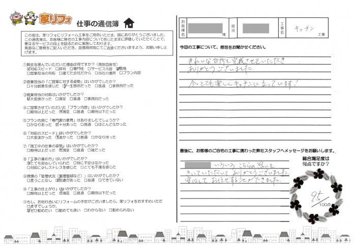 きれいな台所を完成させていただきありがとうございました。 今とても楽しくキッチンに立っています! いろいろこちらの思いをきいていただいてありがとうございました。 安心してお任せすることができました。