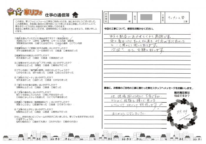 当方の都合にあわせてくれて感謝です。 施工養生など、職人さんたちも対応がすごく良かったと妻より聞いております。 次回またお願い致します。 とにかく経験を積んで更なるレベルUP、スキルUP期待しています! ありがとうございました。