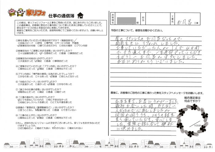 工事していただいた人が1人で4日間で夕方遅くまで、一生懸命やっていただいき