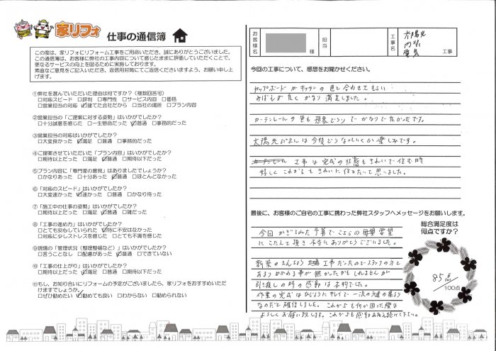 工事は完成の状態もきれいで住む時嬉しくこれからもきれいに住みたいと思いました。