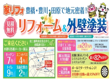 いつも家リフォ 豊橋ショールームをご愛顧いただきありがとうございます。 最新のチラシ情報を掲載いたしました!! 豊橋市、豊川市、田原市、蒲郡市で キッチン・浴室・トイレ・洗面化粧台・外壁・屋根・塗装・エクステリアにお悩みなら 家リフォ豊橋ショールームへお気軽にご相談ください。 ご相談・見積り無料です♪