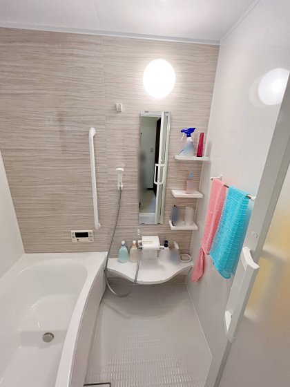 家リフォの担当アドバイザー大野より、「浴槽に入る時に手すりを使えるようにして、手入れがしやすい人造大理石の浴槽」をご提案させていただきました。