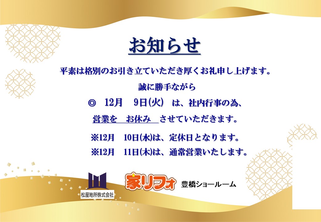 家リフォ 豊橋ショールームからのお知らせになります。 12月9日(火)は社内行事の為、 営業をお休みとさせていただきます。 明日、12月10日(水)は定休日となります。 12月11日(木)は通常営業いたいます。 ご迷惑をお掛けいたしますが、よろしくお願いいたします。