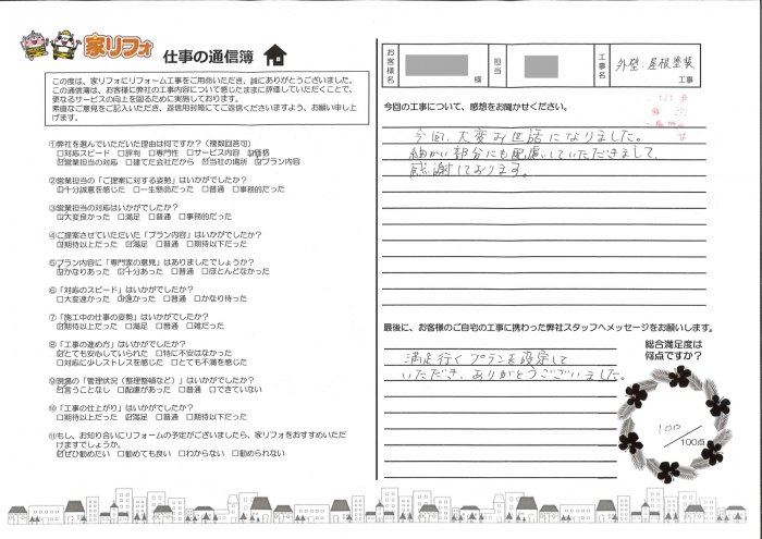 今回、大変お世話になりました。 細かい部分にも配慮していただきまして感謝しております。 満足いくプランを設定していただき、ありがとうございました。